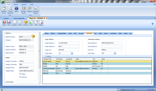 - Addresses Tab - Here you can store all address and phone information for anyone involved in this shipment.