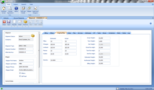 - Weights and Miles Tab - There are fields for estimated and actual weights, miles, line haul, pieces and cubes. There are also fields for a re-weight and billing and authorized weight.