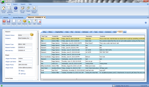 - Notes Tab - Here you can keep track of all correspondence had with anyone involved with the shipment. Phone calls, emails and any other conversations can be recorded here so record is kept of who said what.