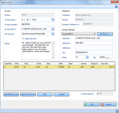 - The Edit Invoice screen is laid out in a clean and concise manner. From here, the Billing Coordinator can quickly and easily add billing charges and commission charges. The invoice address can be sent to a number of different locations and can be filled in with 2 clicks, reducing data entry and saving time. The shipment screen may be opened right next to the Invoice screen for instant reference.