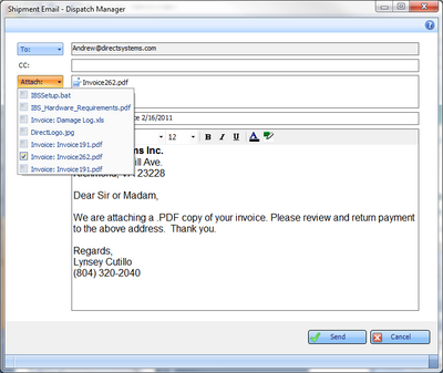 * Select from multiple e-mail addresses and attach electronic documents that are saved to the shipment such as invoices and work tickets. Fully configurable SMTP settings allow for use of popular web mail clients like Gmail or Yahoo. | |||
