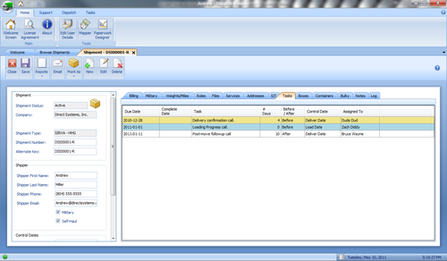 * Tasks Tab - Typically Tasks would be created when you create the shipment to make sure you and your staff follows through on all the confirmation and status calls you need to make to ensure quality service. | |||