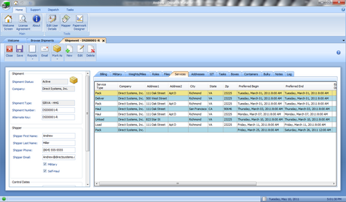 * Services Tab - This is where you indicate what services need to be performed on the shipment such as Packing, Loading and Delivery. There is room for an unlimited number of services. | |||