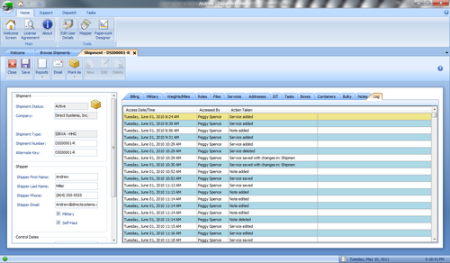 * Log Tab - This tab keeps track of any saved changes to a shipment record, who made them and when for auditing purposes. | |||