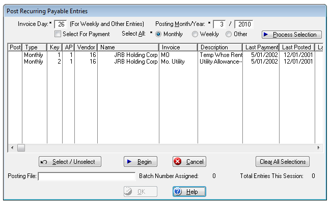 Screen shot of Post Recurring Payable Entries.