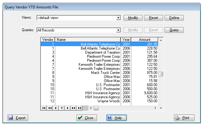 Screen shot of Query Vendor YTD Amounts File.