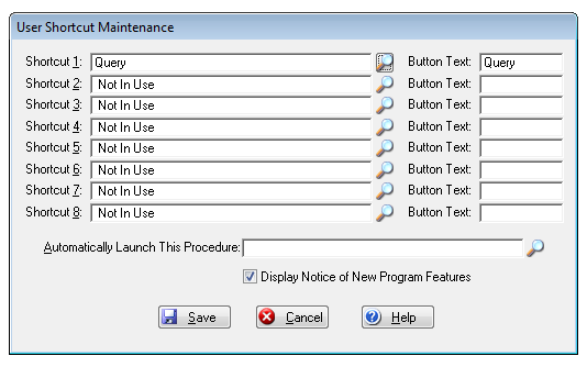 Screen shot of user shortcut maintenance.