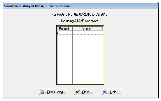 This window titled Summary Listing of the A/P Checks Journal will analyze the A/P Checks Journal for the selected posting period(s) and list the total amount of invoices posted for each month.