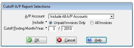 This window titled Cutoff A/P Report Selections enables you to select the invoices you wish to appear on the A/P Cutoff Report.