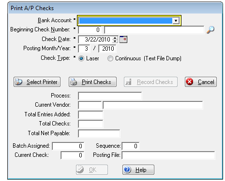 Bank Account: Enter the number of the bank account on which these A/P checks will be written. This bank account number is set up in the Bank Account Manager. To view a list of the available Bank Accounts, press the drop down button to the right of this field. If the necessary Bank Account has not been set up in the system, then go to the Bank Account Manager and set up that bank account.