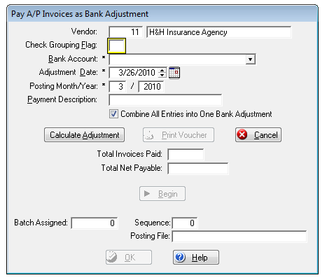 There are occasions when payments are made to a vendor by an electronic funds transfer (EFT) or a bank draft in lieu of issuing a check. This window titled Pay A/P Invoices as Bank Adjustment enables you to record this type of invoice payment as a bank adjustment.
