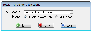 This window titled Totals - All Vendors Selections enables you to select the invoices you wish to include on the Totals--All Vendors Report.