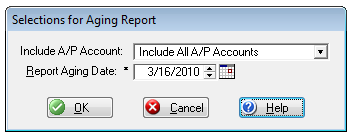 This window titled Selections for Aging Report enables you to select which A/P invoices you wish to include and the date from which these invoices are to be aged.