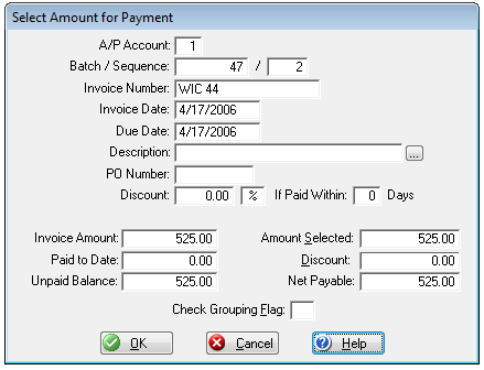 This window titled Select Amount for Payment enables you to manually select the amount you wish to pay on this invoice and you can also add a discount amount, if applicable. This window displays all of the information for this invoice. Most of the fields on this window are informational only so you cannot edit the data in those fields. Only three fields are accessible to the user (Amount Selected, Discount, and Check Grouping Flag).