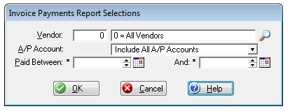This window titled Invoice Payments Report Selections is used to set the parameters for printing a report of invoice payments made during a designated range of dates. You can select to print this report for one specific vendor or for all vendors. You can also select one specific A/P account or all A/P accounts to be included on this report.
