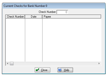 The window titled Current Checks for Bank Number (1, 2, etc.) displays all the checks which have been posted in the system for the designated bank account. This window is used by the Print Checks process to quickly determine the next available check number for a specific bank account when printing checks. The window titled Current Uncleared A/P Checks for Bank Number (1, 2, etc.) displays all of the uncleared A/P checks that have been posted in the system for the designated bank account. This window is used by the Void A/P Checks process to select the uncleared check that you wish to void.