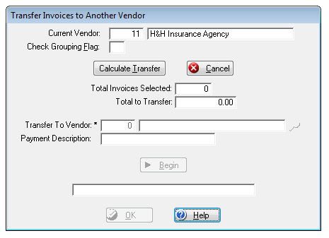 This window titled Transfer Invoices to Another Vendor is used to transfer an existing invoice from one vendor to another vendor. This feature might be used if you have an invoice posted to a vendor but you then decide to pay that invoice via credit card. You could transfer the invoice from the original vendor to your credit card vendor so the actual payment can be reflected against your credit card.
