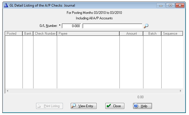 This window titled G/L Detail Listing of the A/P Checks Journal will display all of the instances for the selected posting period(s) in which the selected general ledger account number was used along with the amounts posted to this account.