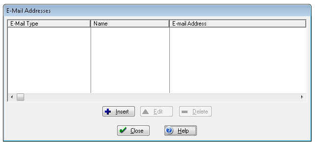 This window titled E-Mail Addresses enables you to attach multiple e-mail addresses to this record. The existing e-mail addresses are displayed in the List Box on this screen.
