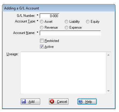 Active: This account can be either Active or Inactive. A check mark in this box indicates an Active Account and a blank box indicates an Inactive account. An inactive account will not be displayed in the Select G/L Account window.
