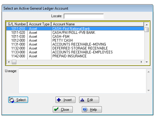 This window titled Select an Active and Not Restricted General Ledger Account will display all Active and Not Restricted General Ledger Account numbers. It will display the G/L Number, Account Type, Account Name, and Useage (if available).