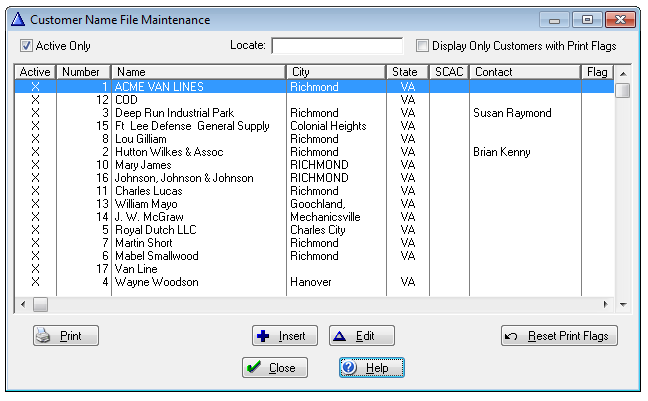 [X] Display Only Customers with Print Flags Checking this box will list only those customers which have a Print Flag specified. This makes it easier to identify which Customers have specified print flags for print flag maintenance purposes.
