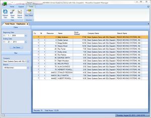 This window will list the total number of hours worked by the employees for the selected spread of dates. This is a quick and useful way to tell which employees are approaching overtime status and to compare the time cards total to the actual assignments.