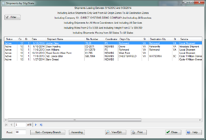 [Filter] Press this button to open the Shipments by City/State Selections screen. Your previous selections will be saved as long as you keep the report open.
