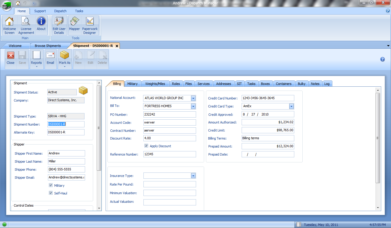 This tab contains customer payment information; who is paying and how. It can capture credit card information if you wish it to.
