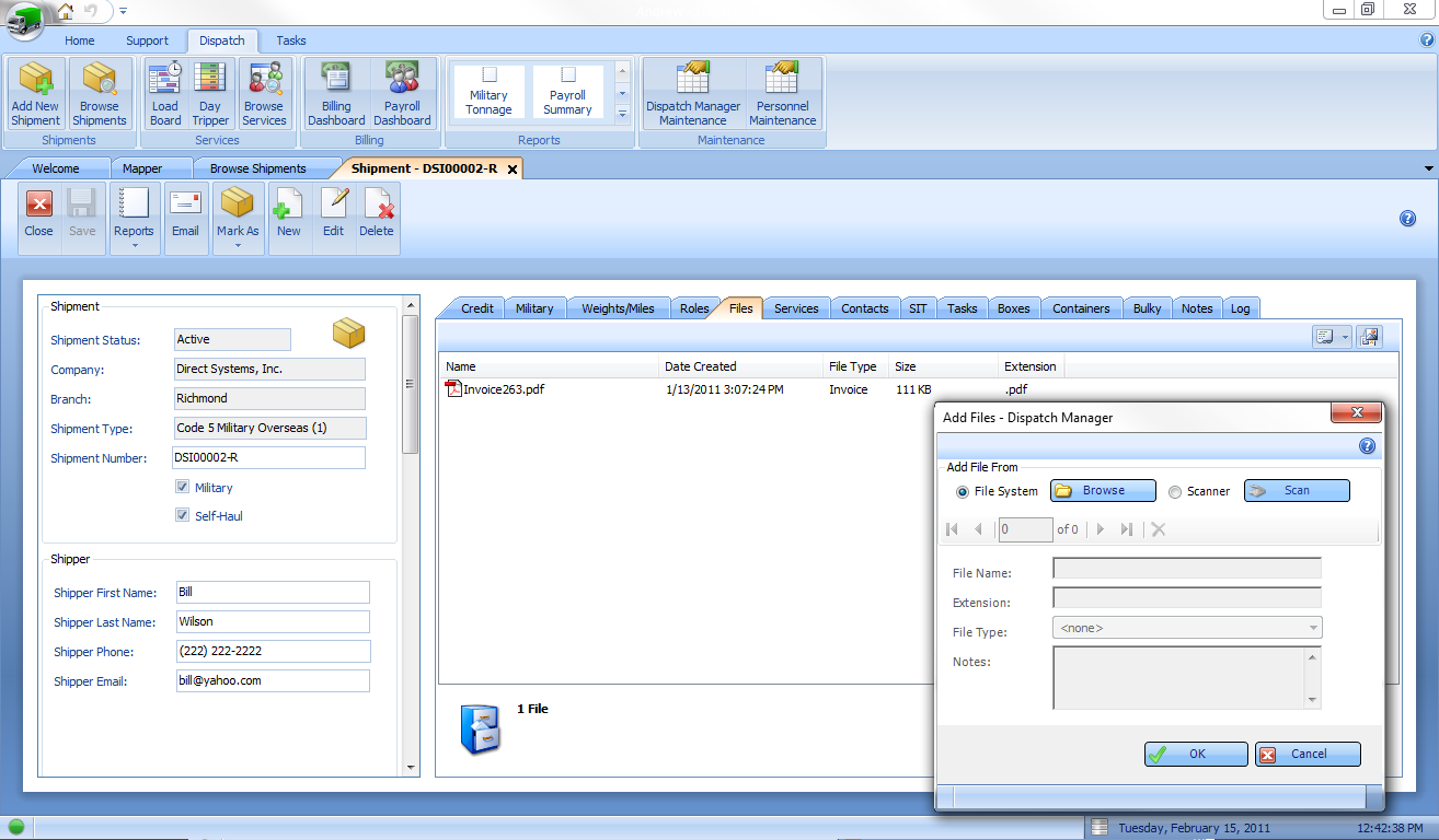 Attach electronic documents to a shipment for lightning fast retrieval. No more sifting through boxes in the warehouse trying to find that misplaced invoice. Our “Add Files” interface makes it a breeze to select an existing file or scan a document right into the system. Email files directly from the shipment details screen.